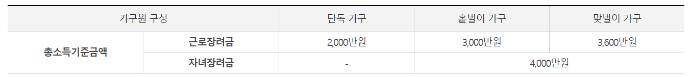 ㆍ가구원 구성에 따라 연간 부부합산 총소득금액1)이 기준금액(단독2천만원, 홑벌이3천만원, 맞벌이36백만원) 미만이어야 하며, 총급여액 등2)에 의하여 장려금 산정