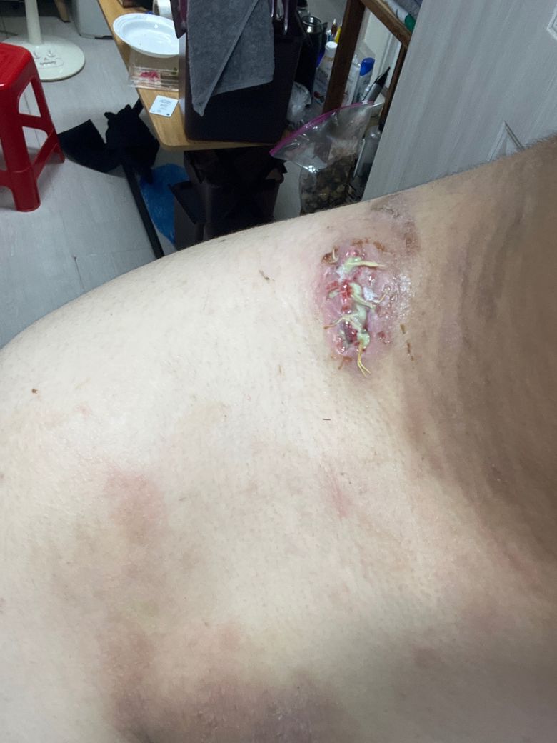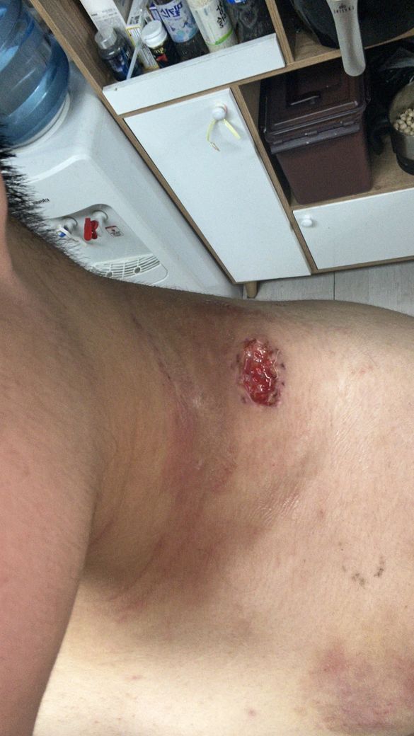 승모근 쪽에 비지혹이 났다 하더라구요 절개를 하고 내용물을 빼내고 봉합을 했는데요 땀을 흘려서 그런건지 하루뒤에 첫번째 사진처럼 진물이랑 고름이 엄청 나오더라구요 그래서 병원을 가서 실밥을 풀었습니다 지금은 2번째 사진인 상태인데요 소독 잘하고 드레싱 잘하면 자연치료 가능할까요?
