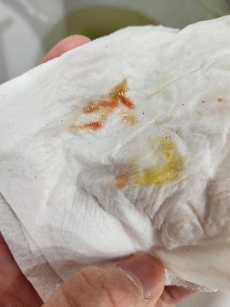 그리고 7시간정도 후에 갑자기 긴장이 되어 설사를 하였는데 점액같이 보이는 것에 붉은 물질이 섞인 것이 휴지에 묻어나왔습니다.. 고춧가루가 아닌 혈변일까요?