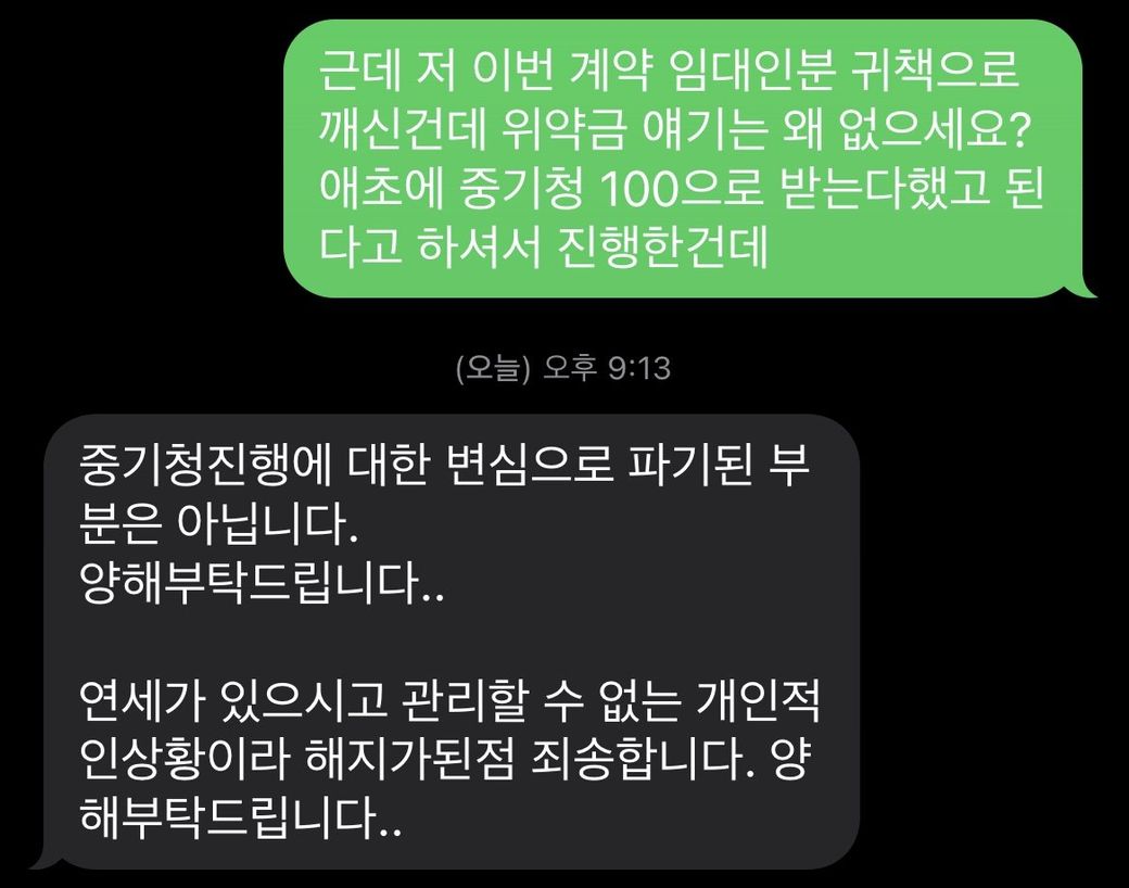 그런데 처음부터 이 계약을 진행할때 중기청 100이 가능하다고 해서 계약한거고 제 문제로 중기청이 안나온게 아니라 집주인 문제로 안나온건데 제가 위약금을 받을수없는건가요?