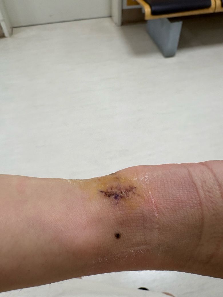 우선 현재로써 깨끗한 흐르는 물에 가볍게(문지르기 금지) 세척 해주시고, 깨끗한 수건 또는 거즈로 물기 제거 후 소독약 및 연고를 바르시길 바랍니다.