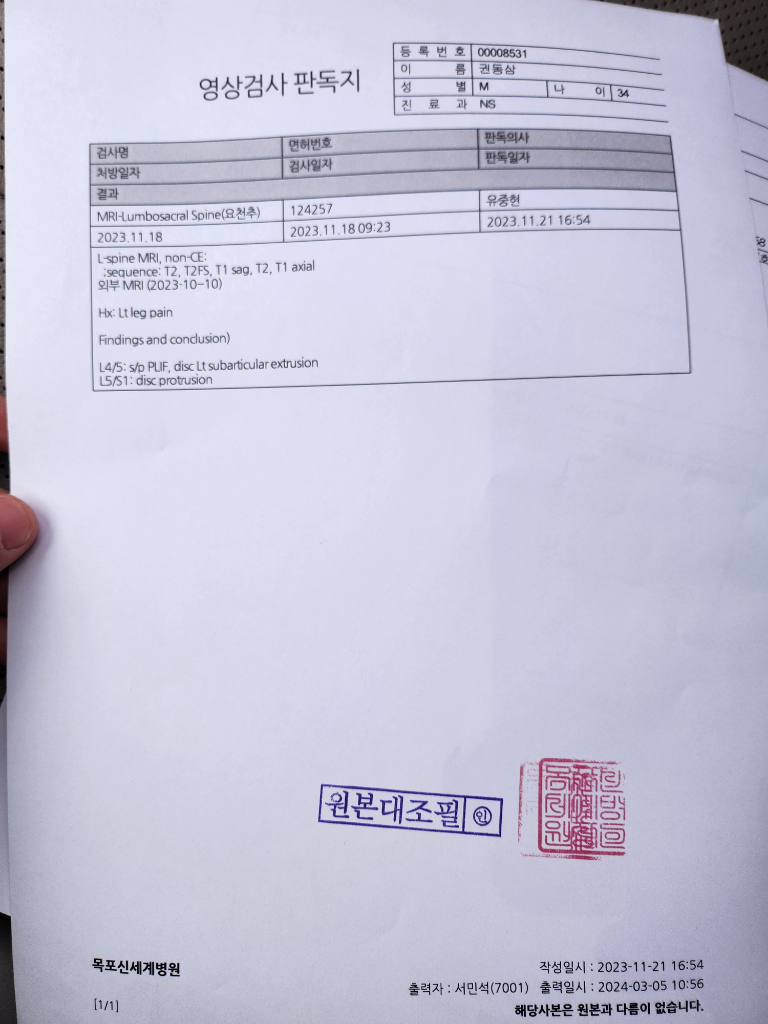 척추의 허리뼈 5번 - 엉치뼈 1번 디스크 돌출이 있는 것으로 보이며 허리뼈 4-5번 은 이전에 골융합술을 받으신 상태로 왼쪽 측와부위로 디스크 탈출증이 있는 소견입니다.