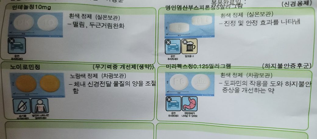 1. 인데놀,부스피론정,노이로민정 복용부작용 중 하지불안 증후군이 있는지