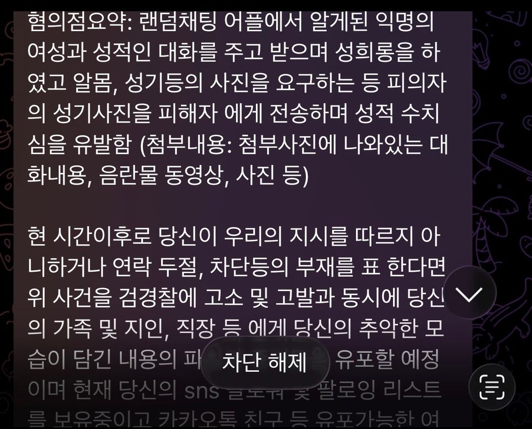 랜덤채팅을 하다가 인스타를 하자고 해서 연락을 하던 도중 그분이 자기는 야한거 하려고 하는데 텔레그램 추가하자고 해서 재밌어보여서 친구추가를 한 뒤 연락을 하던 도중 “취향이 있냐”라고 물어서 없다고 하고 그 분이 주도적으로 야한 이야기를 해서 제가 재미도 없고 이상한 느낌이 들어서 그냥 재미 없다고 하고 방을 나갔습니다.