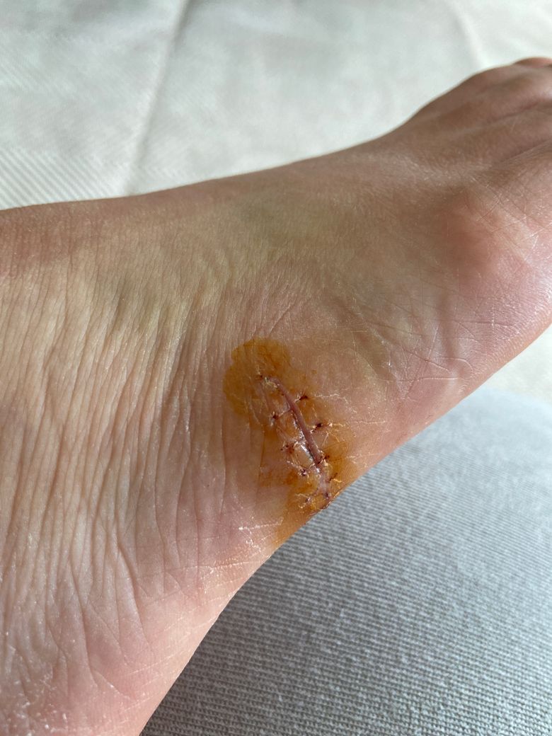 4월 22일(토) 새벽에 유리병을 잘못 밟아서 발바닥+발등 부분이 4cm정도 찢어졌고 응급실에서 상처 소독 및 봉합을 했습니다.