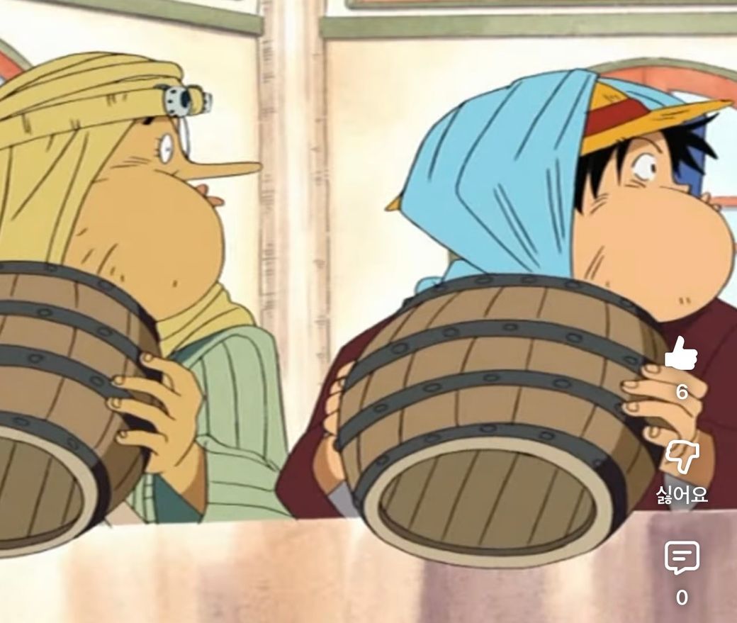 스모커와 마주친 루피와 우솝이 정체를 들키지 않기 위해 물을 마시는척 하는거죠