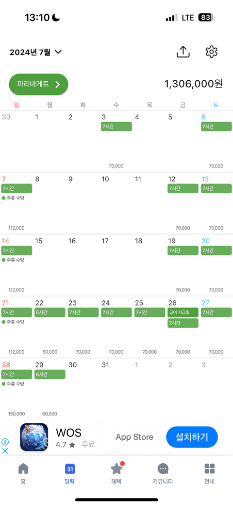 사진에 나와있는것처럼 넷째 주에 사장님 요청으로 평일에 다 나왔는데 그러면 주휴수당이 8만원이 됩니다 원래는 4~5만원씩 매달 주휴수당 받고있어요