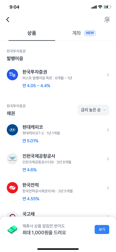 토스뱅크에서 한국투자증권 채권 상품 연계해주는데