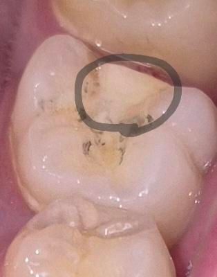 동그라미 친 부분의 하얀색은 인레이치료를 할 당시에 충치를 파내고 울퉁불퉁해진 구멍을 인레이가 들어갈 수 있게 매끈하게 메꾸기 위해 사용한 충전재료입니다.