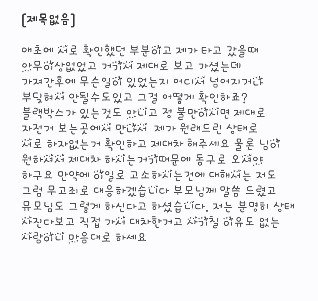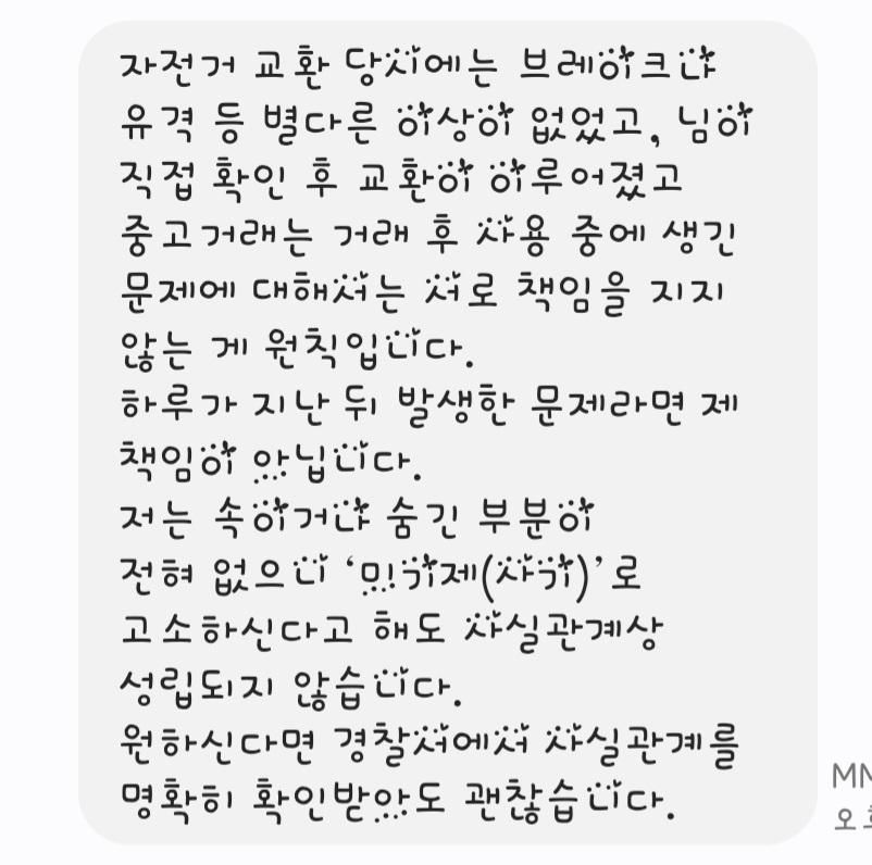 제가 자전거끼리 교환을했는데 그사람이 하자,기스 사진을 주어서 직거래때 사진에 보이는 하자와 그외 상태를 확인해보고 거래를하고 자전거를 타보았는데 패달이 유격이조금있고 브레이크도 반쯤 끊어져있고 기제를 하지않은 하자도 있었고요. 근데 그사람은 몰랐다고하고 제가 타다가 그랬을수도있지않냐는식으로 말해서 제가 타다가 그럴수도있는 기스는 배상안해도된다고했고. 육안으로 확인이 어려운 브레이크와 유격만 배상해달라고하였고 그것도 안된다고하셔서 제돈조금 낼태니 조금만 보상해달라했는데도 안된다고 그냥 신고하라고하시네요. 몰랐다고 본인은 무고죄로 고소한다고하시고요 사진은 상대방분이 보내신 문자입니다.