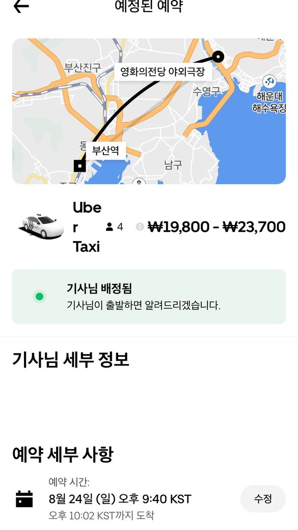 1. 제가 내일 오후 9시 40분 부산 영화의 전당 -> 부산역 가는 우버택시를 미리 예약했고, 상세페이지 들어가보면 아래 사진처럼 뜨는데 정말로 오후 10시 2분에 도착하나요? 늦어도 10시 10분 전까지는 도착하겠죠 ㅠㅠ