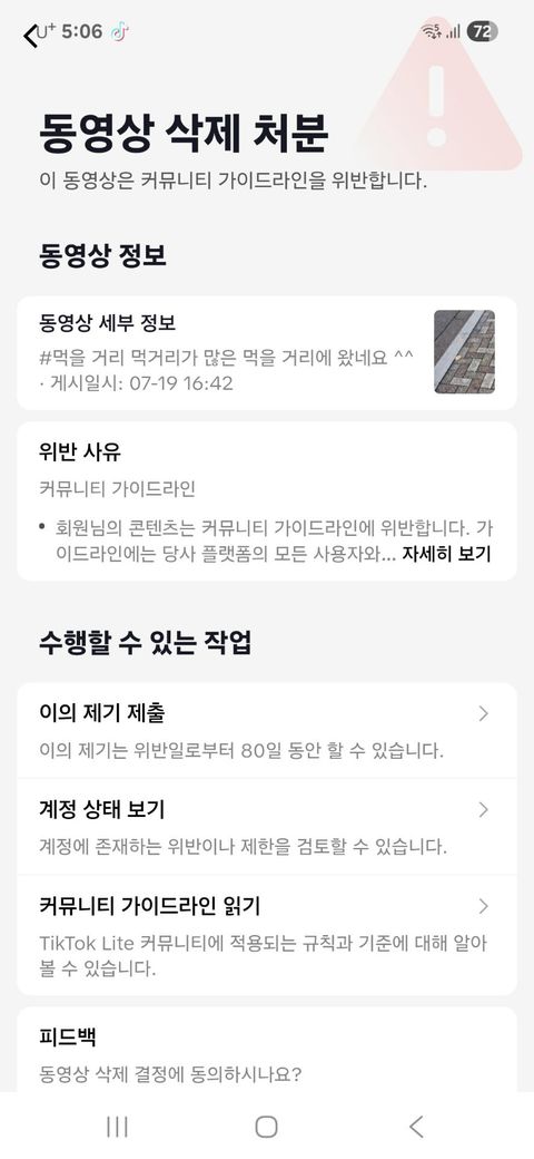 제가 먹거리 동네에 음식점들 간판이 나오는 1분 짜리 영상을 올렸는 데 유튜브, 인스타는 정상으로 업로드 되었는 데 틱톡에선 가이드라인 위반 강제 삭제 되었네요