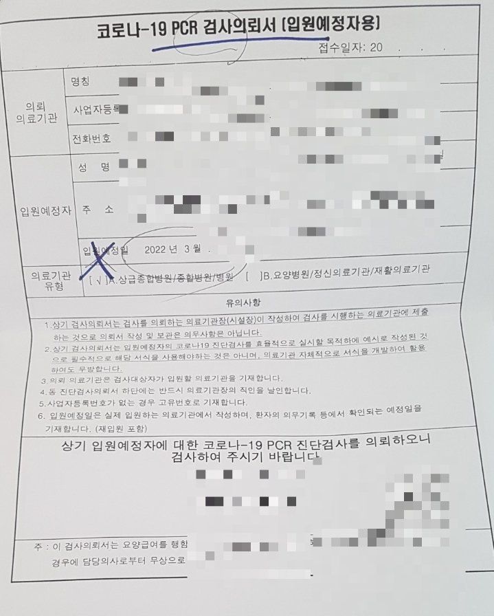 병원에서 pcr검사의뢰서를 받아왔는데 이거만 보건소에 보여주면 pcr검사 받을 수 있을까요? 입원하는게 아니면 pcr검사 못 한다고 할까 싶어서요. 제가 받은 검사의뢰서를 사진을 첨부하였습니다. 답변 부탁드려요!