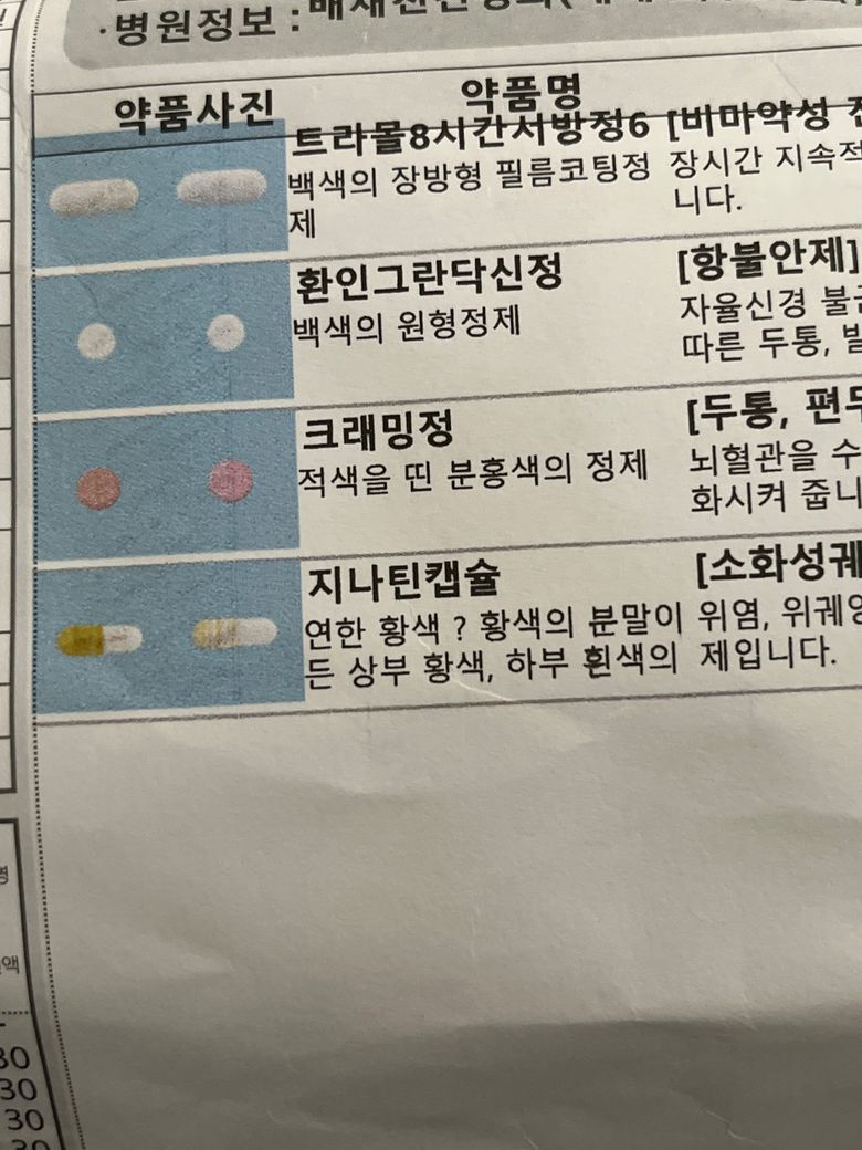 현재 복용하시는 약물중 트라몰서방정, 그란닥신정, 크래밍정의 트라마돌,토피소팜, 에르고타민 성분이 때떄로 오심 구토를 일으 킬 수 있기 때문에 다 오심 구토 부작용이 있습니다. 너무 심하시면 구토 부작용이 비교적 덜한 타이레놀로 바꿔보시는걸 권해드립니다.