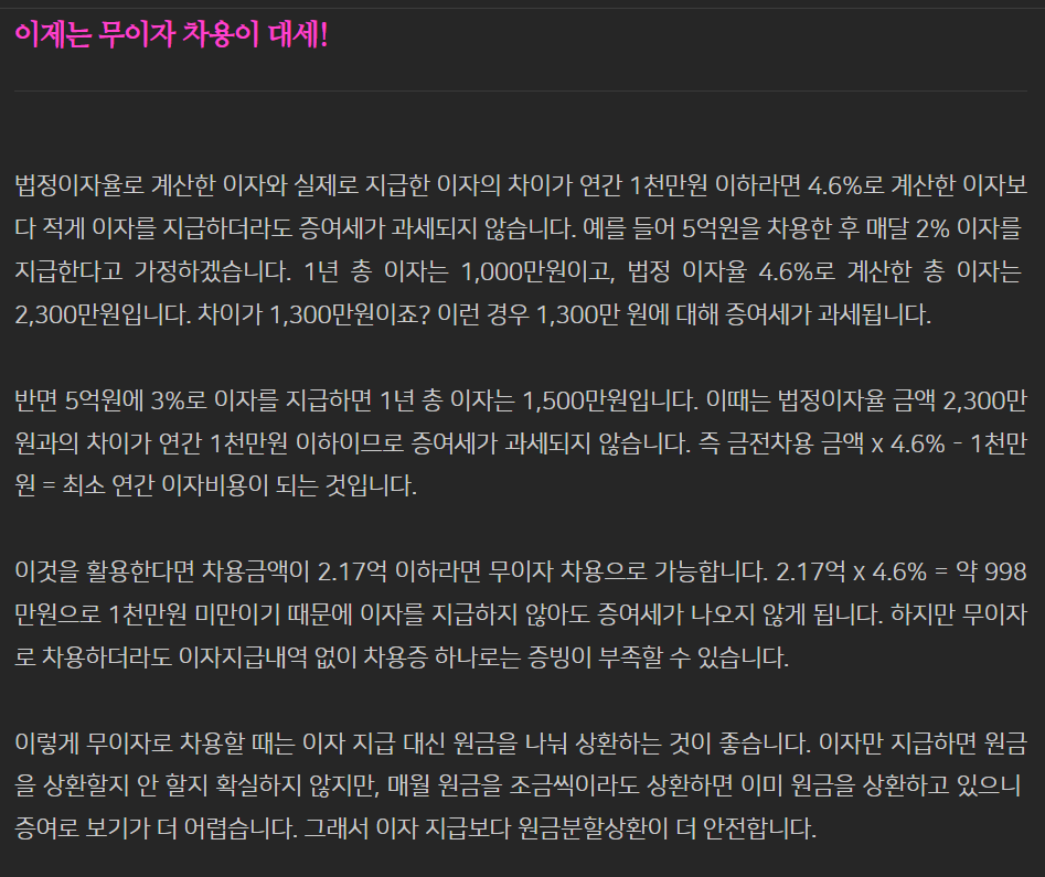 그래서 6천만원을 빌린다고 가정하고 이자 및 상환 기간을 설정할 경우 법적 최소 이자 4.6%를 지급하도록 차용증을 작성해야한다고 했는데 관련 글을 읽다 보면 2.17억까지 빌릴 경우 4.6%로 빌려도 연 이자가 1천만원 미만이기 때문에 이자 없이 원금만 갚아도 된다라는 내용이 있습니다.