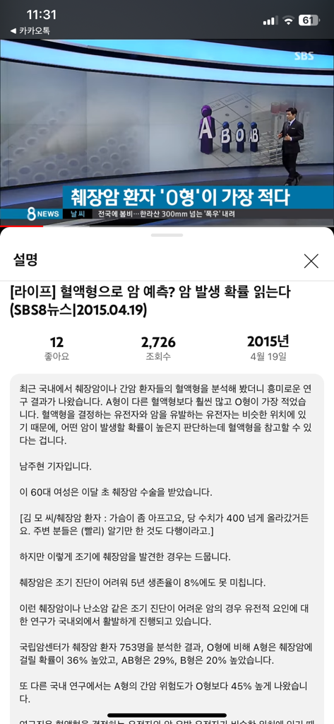 저 자료 하나만으로 판단하기는 어렵고, 혈액형에 따라 췌장암의 위험도가 약간 달라질수도 있겠다.. 이정도로 생각하는게 좋겠습니다.