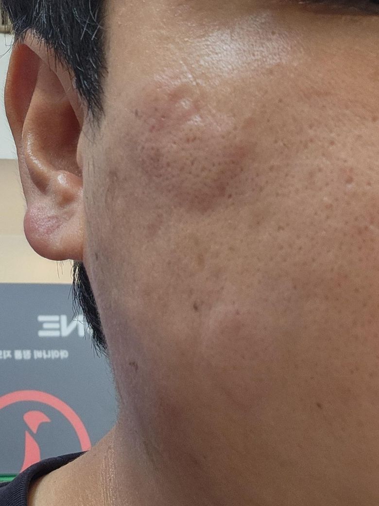 현재 증상과 사진만으로 정확한 판단은 어려우나 급성으로 생긴 병변이라면 알러지 반응의 일종인 혈관부종을 감별하는 것이 좋겠습니다. 어떤 물질이나 환경 후에 발생한 병변인지 전신 열감이나 호흡곤란은 없는지 확인이 필요해 보이며 해당 증상이 있다면 즉시 응급실로 내원하시는 것이 좋겠습니다. 하지만 피부염증이나 만성 두드러기의 가능성도 있어 먼저 정확하게 피부과에서 진료를 보시기를 권고합니다.