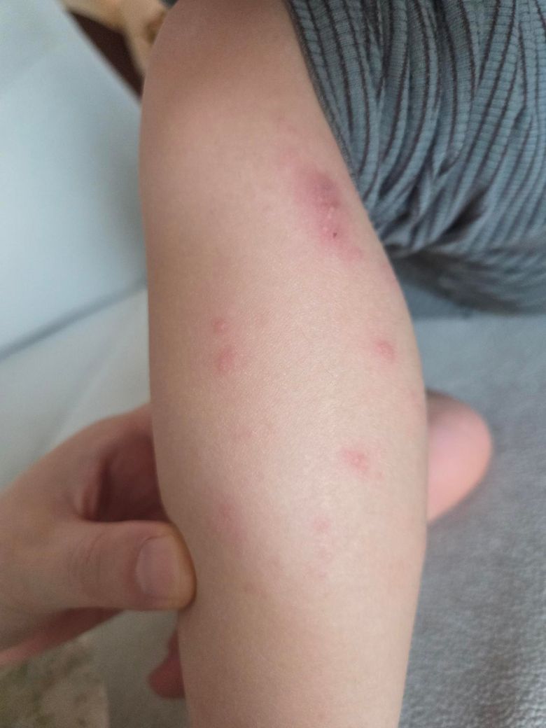 다발성 발진과 함께 작은 수포성 병변이 관찰되고 있어 가려움이 있다면 알러지성 피부 질환이 가능성이 높고 가려움이 없다면 바이러스 감염 등에 의한 피부 발진 가능성이 있습니다. 면역 억제제를 복용하고 있다면 면역 억제제에 의한 이상 반응 가능성도 고려해야 합니다. 상기 질환 중 가장 문제가 될 수 있는 것을 감염성 질환인데 발열 등의 동반 증상이 있는지 확인해 보시고 증상 지속시 혈액검사가 가능한 소아과 내원하여 진료를 보시기 바랍니다.