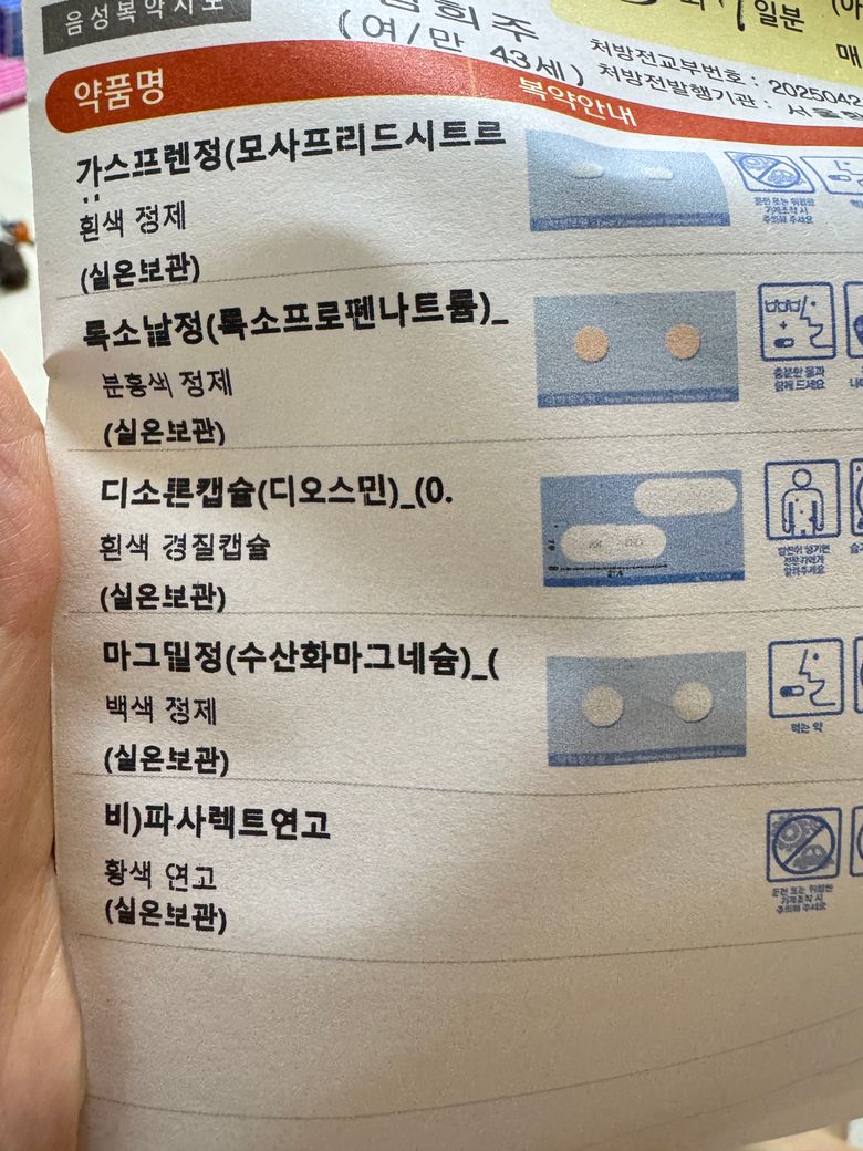 병원가서 검사후 안에가 찢어졌다며 약과 연고를 처방받았는데요 가스프렌정 록소날정 디소론캡슐 마그밀정 파사렉트 연고를 처방받았습니다