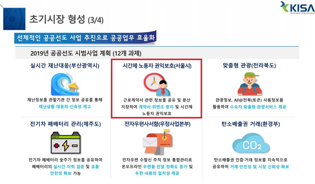 2019년 공공선도 시범사업 계획에 보면 시잔제 노동자 권익 보호를 위한 블록체인 선도사업이 진행되었습니다.