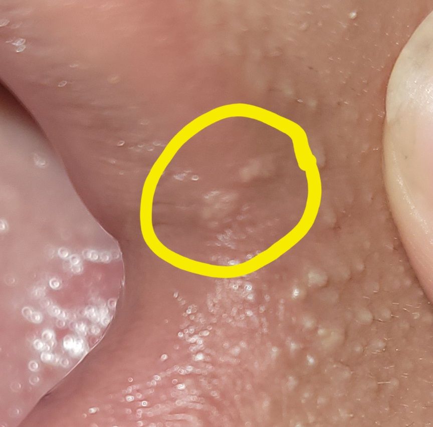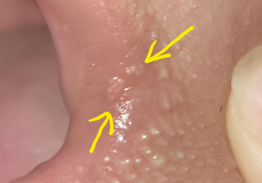 2번 사진은 윗입술 내에 하얀 피지같은게 생겼으며 여드름처럼 주변이 부풀어 오르거나 돌출하지 않았습니다 하얀점같으며 별다른 신경쓰지 않아 생긴지는 몇개월이 지났습니다