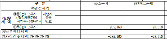 그리고 작성하려고 보니 원천징수 소득세에 근로소득원천징수영수증 상의 소득세 결정세액 부분을 입력하라는데 사진처럼 아무것도 없으면 그냥 0 으로 넣으면 되는건가요?