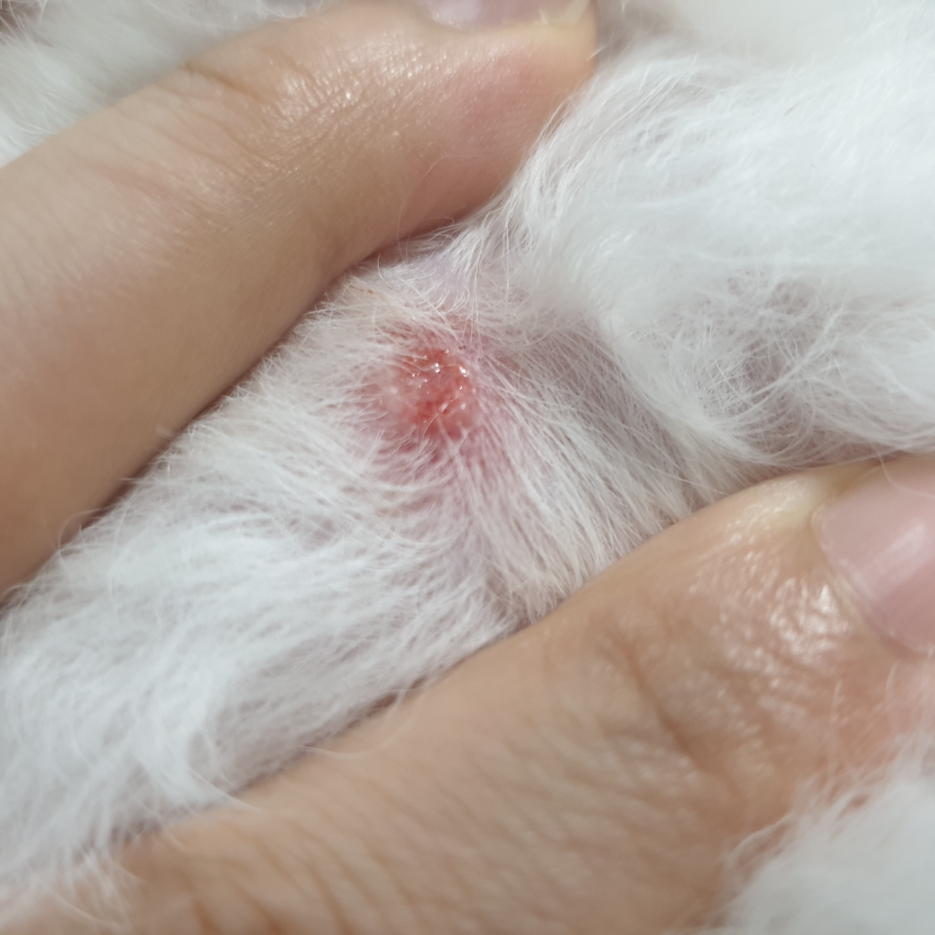 사진에 보이는 병변은 원발 병변이라기 보다 원발 병변을 간지러워서 이빨로 잘근잘근 긁어서 생긴 양상의 가능성이 높아 보입니다.