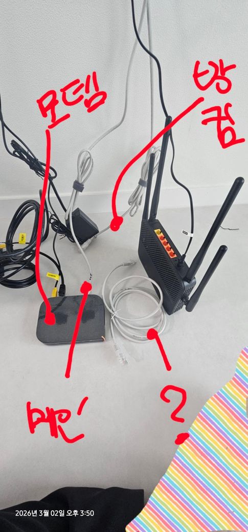 2. 메인은 벽에서 나오는 인터넷선 모뎀 인터넷 포트에 연결중