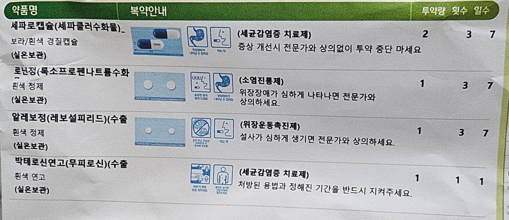 1명 평가처방 내역을 보니 항생제가 두 종류이긴 하지만 경구약은 세파로캡슐 하나이며, 다른 한 종류는 마르는 연고입니다. 이외에는 염증을 줄이는데 도움을 줄 수 있는 소염제와, 항생제와 소염제가 속에 부담을 줄 수 있기 때문에 위장운동촉진제를 동시에 처방을 한 것으로 보입니다. 종합적으로 보았을 때 처방에는 별다른 문제가 없어 보입니다.