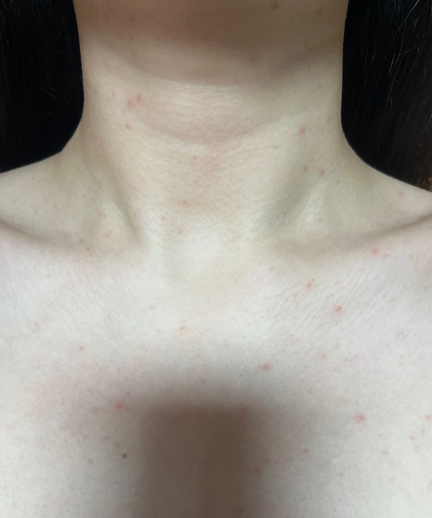 사진상 병변은 작은 홍색 구진들이 모낭을 중심으로 흩어져 분포하고 있고, 팽진 형태나 일시적으로 사라지는 양상은 보이지 않습니다. 임상 양상과 병력을 종합하면 두드러기보다는 여드름성 병변, 보다 정확히는 체간부 여드름 또는 말라세지아 모낭염 가능성이 높습니다.