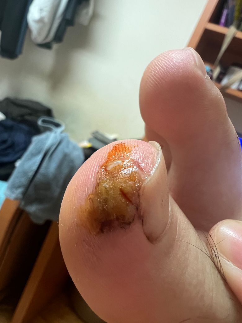 주말에 다쳐서 병원을 못가서 빨간약 바르고 진물 나오면 조금씩 짜내고 있습니다