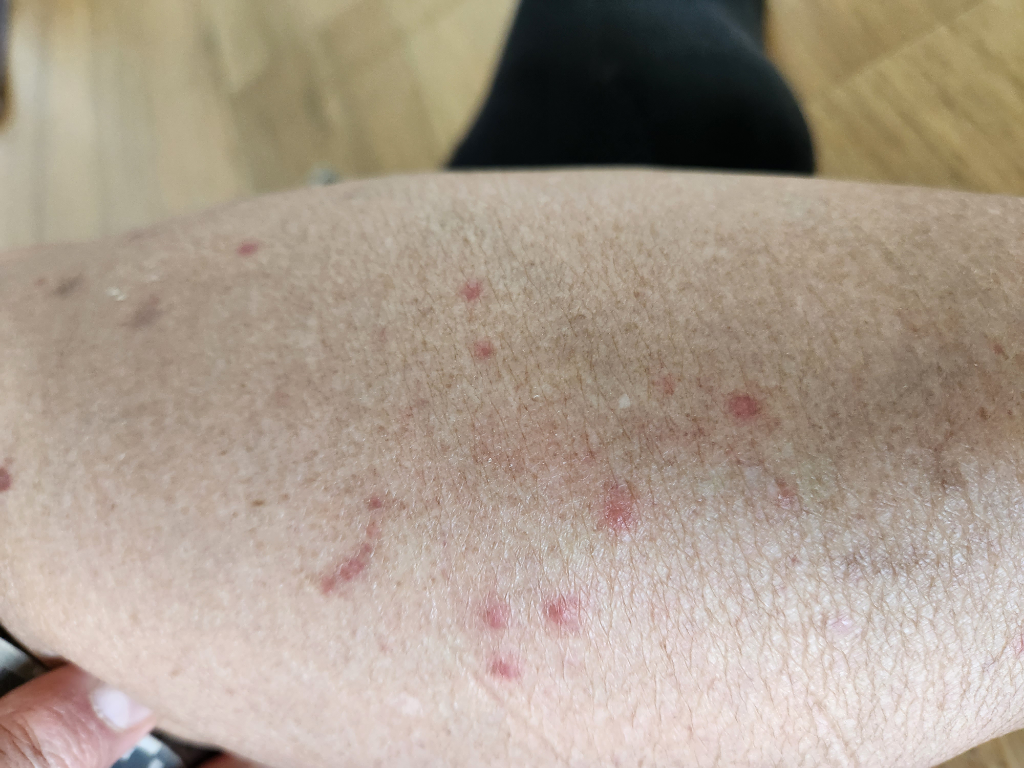 접촉 알러지 증상으로 보입니다.흔히말하는 풀독가능성이 있어보입니다. 불편한증상이있다면 긐처의원에서 약처방받아복용하세요