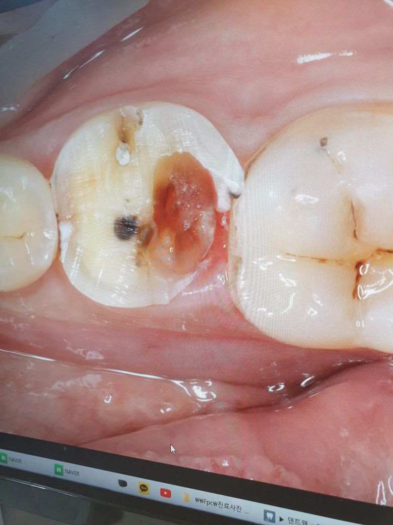 치과의사마다 생각은 다를 수 있습니다 흔히말해 저렇게 옆구리가 터진 치아는 신경치료를 해도 살리기 어려운 경우, 신경치료를 해도 금방망가지는 경우가 많습니다