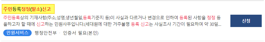 1) 사이트 입장 ☞ 중앙 검색어에 아래와 같이 입력합니다. 입력검색어: 주민등록정정신고