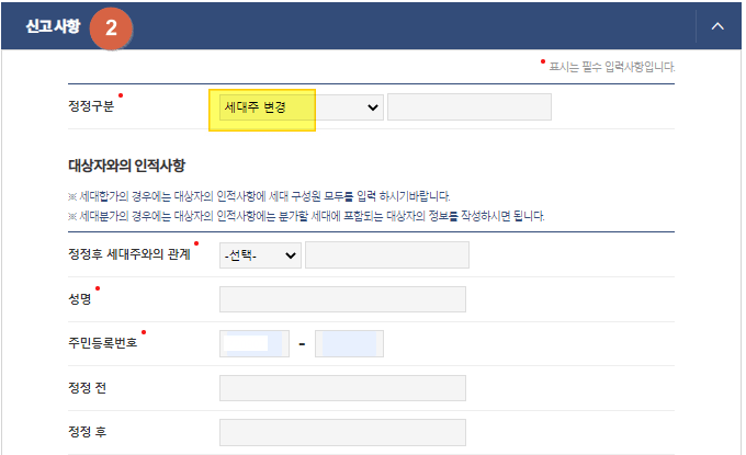4) 신고서에는 신청구분에 정정으로 하시고 신고인과 신고사항을 작성하시고 민원신청하시면됩니다. 1~5번까지 순서대로 작성하시면 됩니다.
