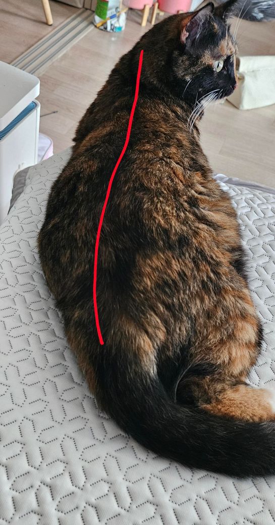 고양이가 그냥 서있을 때 척추 따라 등줄기요!