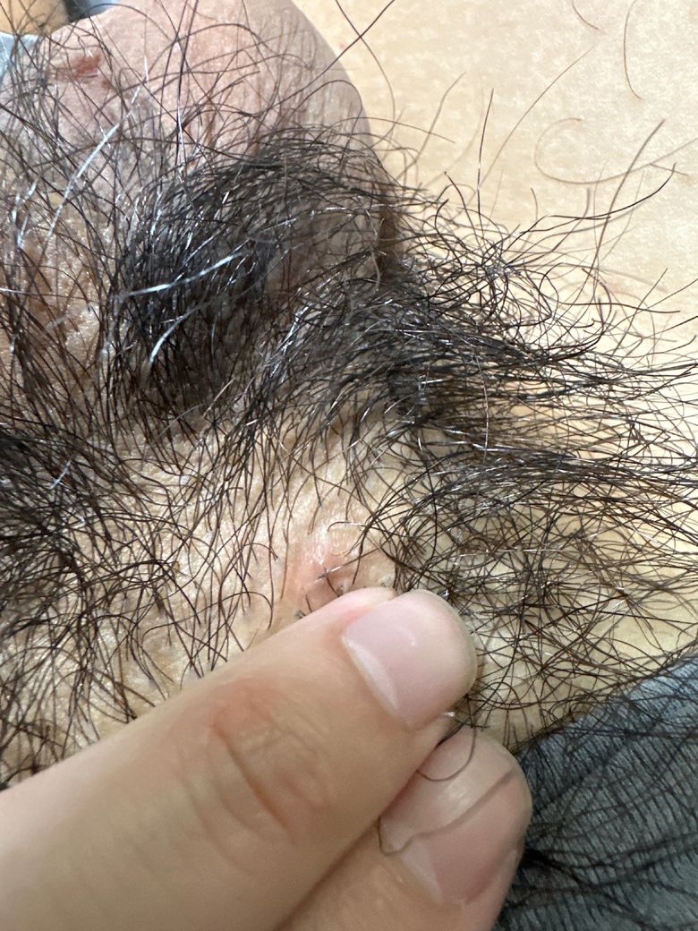 해당 병변은 수포처럼 관찰되지 않습니다. 헤르페스로 의심되지 않으며 모낭염이 가장 의심됩니다.