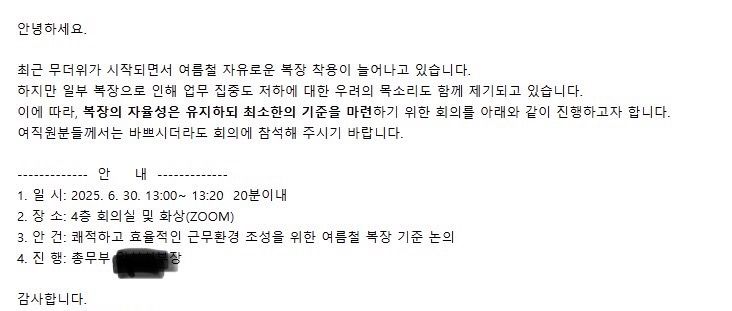 >>금요일 오후 5시 30분 이후에 ‘여름철 복장 기준 마련을 위한 회의‘라는 제목으로 메일을 보내 월요일 1시에 회의를 하겠다함.