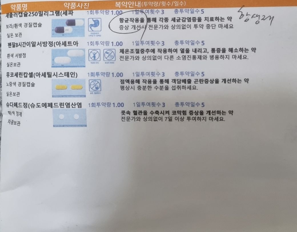 처방받은 감기약과, 은교산 성분의 소렉신은 별다른 상호작용을 유발하지 않으므로 함께 복용해도 괜찮습니다.