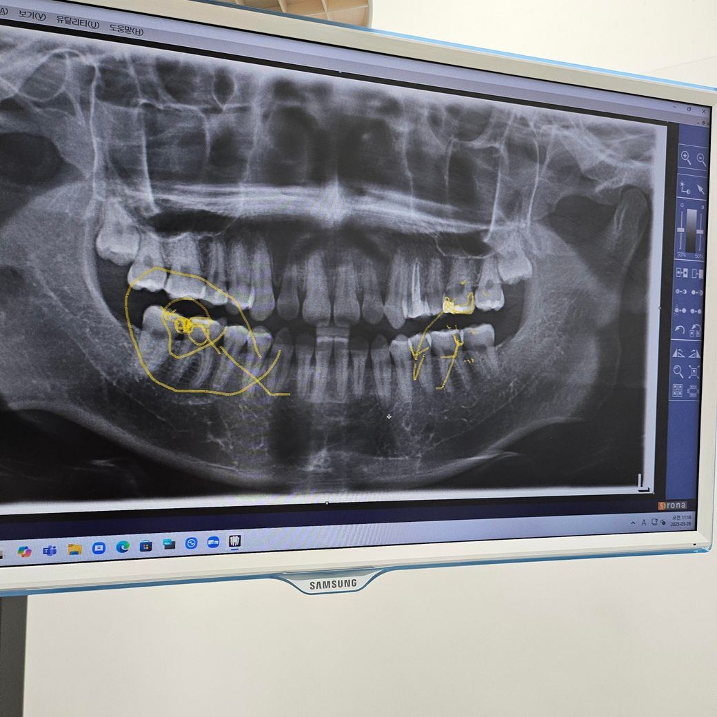 엑스레이 상으로 충치가 많이 깊어 보이고 치아 사이도 충치가 잇는거 같습니다 .인레이나 크라운 치료를 하셔야될것같습니다.