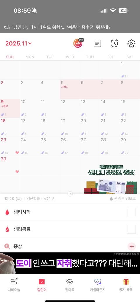 11월 23일 관계와 휴약기 1일차인 11월 30일 관계에 임신 가능성은 적어요