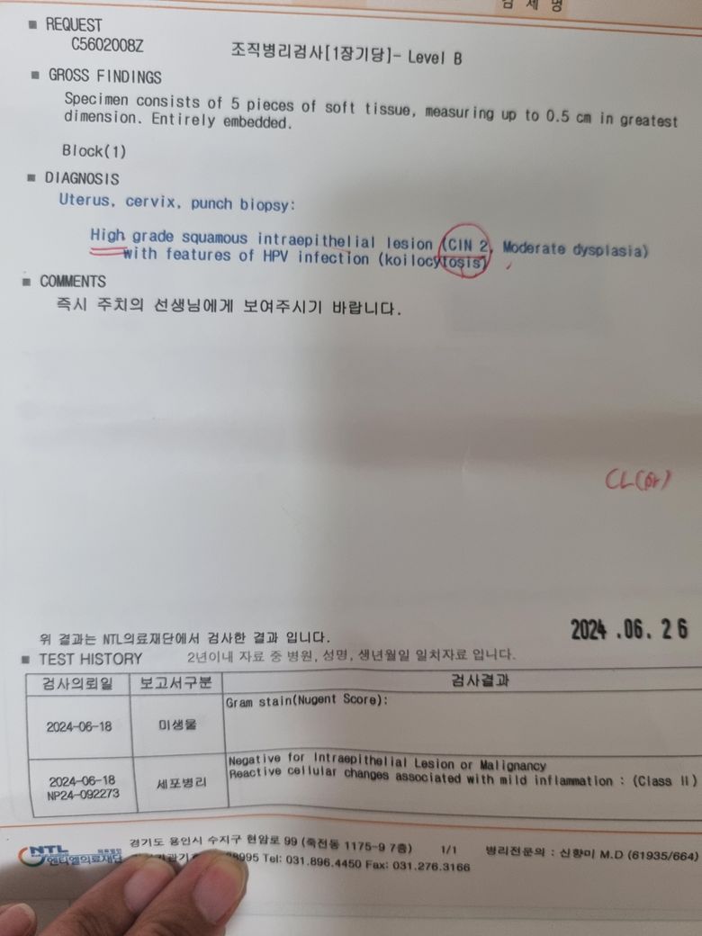 검사 결과 때문에 많이 놀라셨을 텐데요. 올려주신 결과지에는 자궁경부 이형성증 2단계(CIN2)로 나와 있습니다.