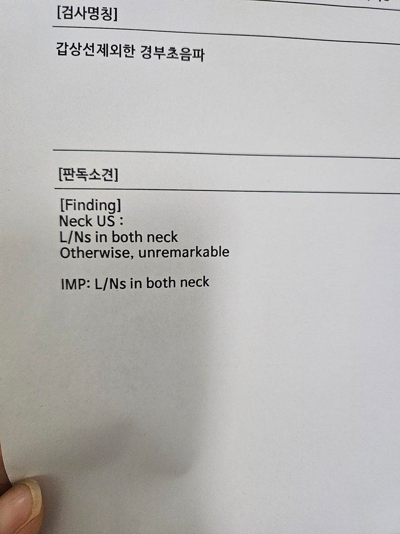 초음파 소견으로는 림프절들이 보이며 부어 있다 정도로 보입니다. 이외에 특별하나 소견이 따로 있거나 해 보이지 않습니다. 약물 치료를 하여도 회복이 되지 않다면 추가적으로 약물 복용을 해주며 경과를 지켜보거나 보다 정밀 검사를 통해서 다른 문제는 없는지 감별해보는 방향이 있겠습니다. 이비인후과적으로 재차 상담을 받아보시는 것을 권고드립니다.