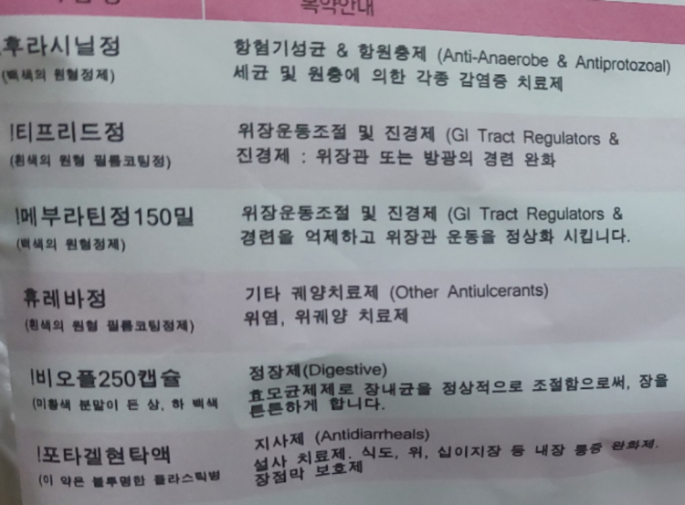장염약들은 물로 삼켜먹고 까스엔프리는 씹어서 드세요.