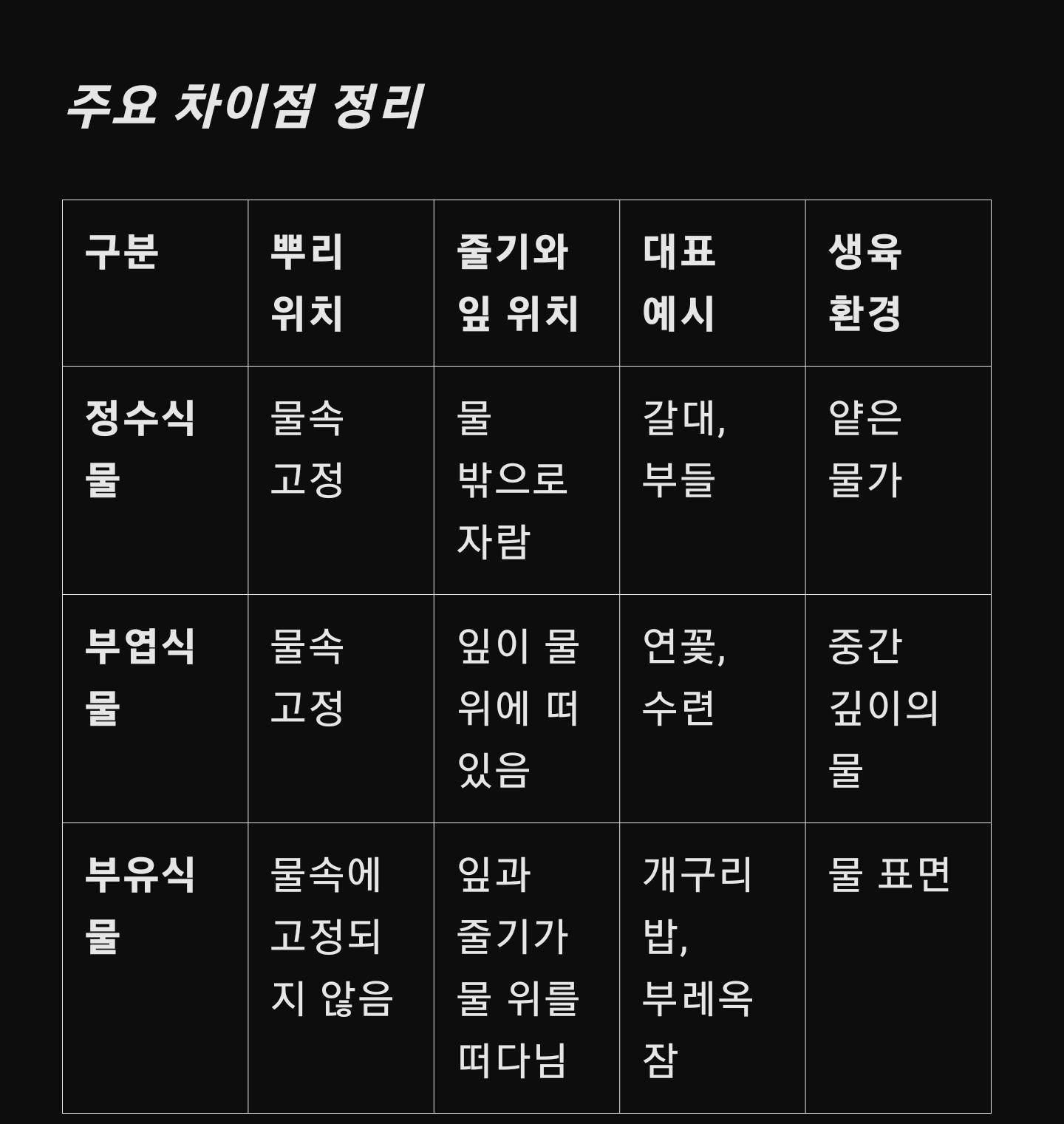 사진으로 봤을땐 전부 물에 떠있어서 같아보여서 차이를 모르겠어요.. 정수식물, 부엽식물, 부유식물 차이점 알려주세요. 예시 식물도 알려주세요.