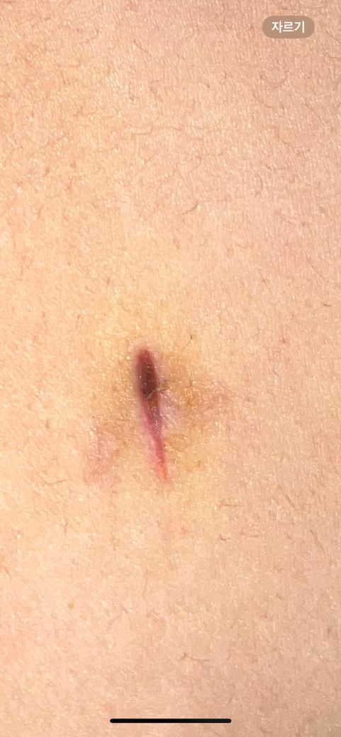 복강경 수술 후 배액관자리인데 살짝 벌어져있고 그 안으로 딱지져있는 상태입니다