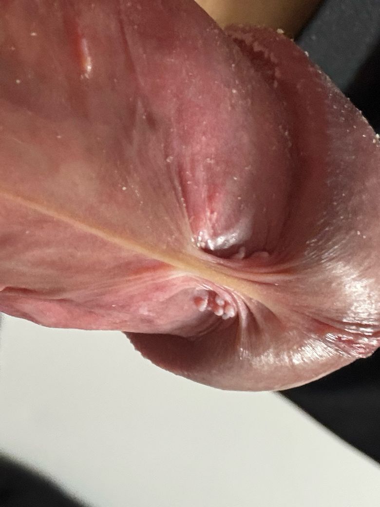 사진과 병력상 귀두 가장자리에 균일하게 배열된 작은 흰색 돌기 형태이며, 중학생 때부터 변화 없이 유지된 점을 고려하면 성병보다는 정상 변이인 진주양 음경 구진 가능성이 가장 높습니다. 이는 감염성 병변이 아니고 성접촉과 무관하며 전염되지 않습니다. 임상적으로 통증이나 분비물 없이 일정한 크기와 모양으로 배열되는 것이 특징입니다.