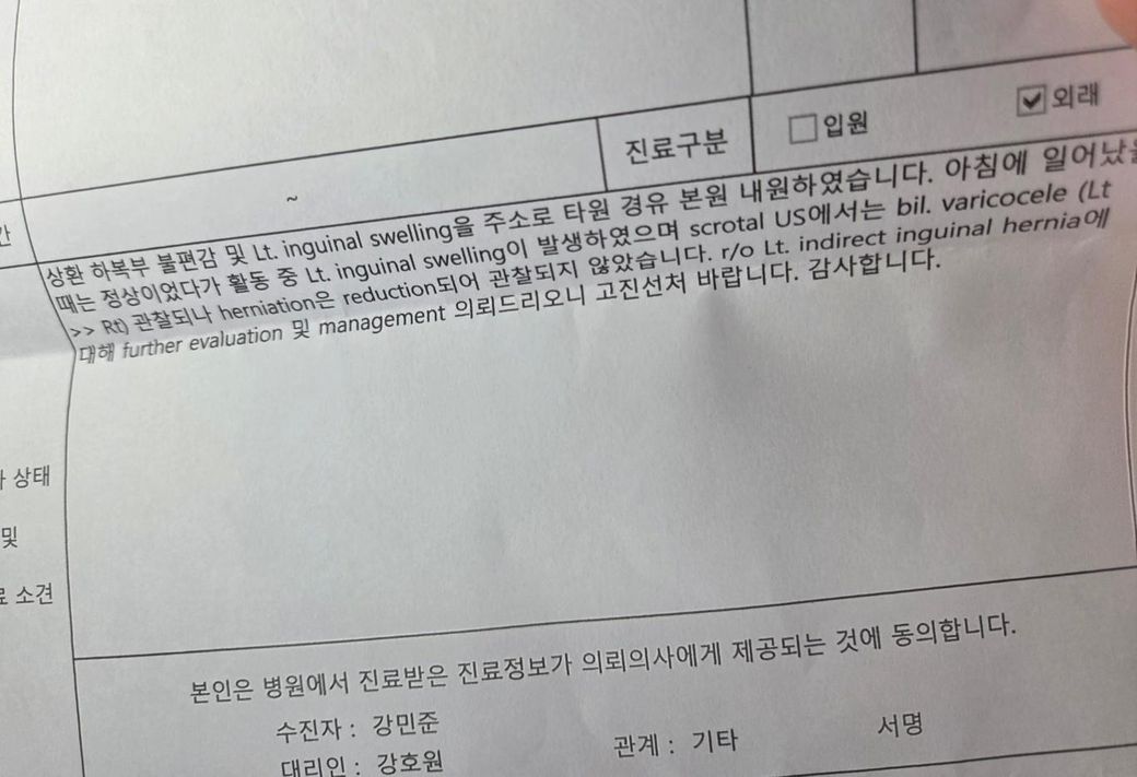의뢰서 내용과 초음파 소견을 보면 정계정맥류는 좌측에 양측성으로 확인됐고, 서혜부 쪽은 “탈장 의심(r/o indirect inguinal hernia)” 정도로 적혀 있습니다. 즉, 탈장이 확정된 건 아니고 가능성이 있어 외과에서 추가 확인이 필요하다는 의미입니다.