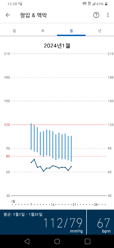 아래 보름간 혈압은 선형적으로 떨어지고 있는 중인데(아침기상 후, 취침전 안정시 양팔 각 3번, 하루 총 12번 측정값), 아직도 병원 자동혈압계로는 심리적으로 두근거려서 고혈압 전단계 수치가 나올 때가 있습니다.