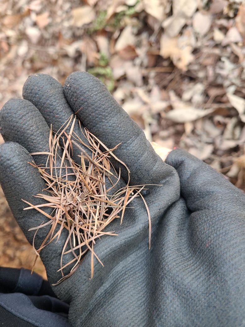 소나무입니다.잎만 보아도 바늘모양이고, 겉에 껍질도 흑갈색으로 겨울철 잎과 껍질이 마른 소나무로 보이네요.등산하다보면 자주 보입니다. 가끔 길거리에도 있구요.